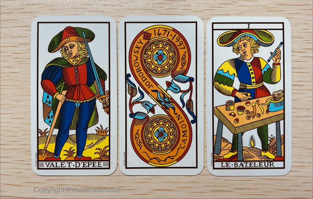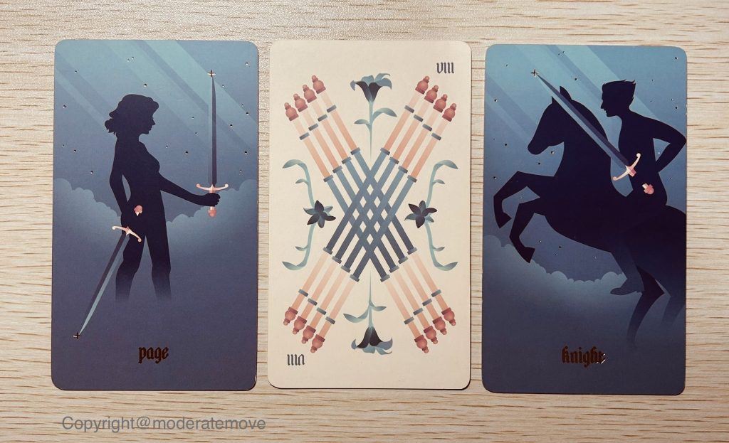 牌面從左至右,依序為:寶劍侍者、權杖八、寶劍騎士。一開始映入眼簾的,是寶劍侍者與寶劍騎士彼此對望的畫面。兩個人物直視對方,像是已經看見彼此,也願意朝對方前進。那一刻的直覺,很自然地讓人感到關係似乎是有流動、有可能性的。