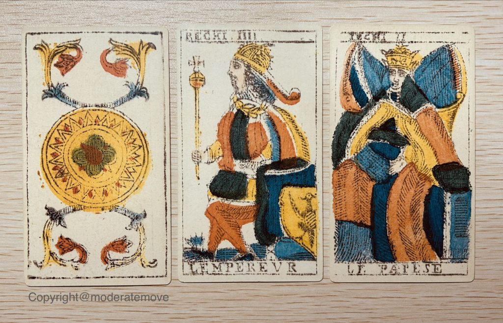 牌面由左至右為:錢幣一、皇帝、女祭師。皇帝與女祭師的視線皆朝向左方,使整體解讀方向轉為由右向左。女祭師端坐於椅上,翻開的書靜置於膝上,整體呈現出靜止、內收的狀態。皇帝乍看同樣坐著,但細看雙腳,卻並未穩穩落地,而是呈現彎曲、近似備戰的姿勢。彷彿隨時可以彈起,迅速行動。行動力,在此悄然醞釀、提升。最終出現的是錢幣一。一枚可被牢牢握在手中的實體。它既象徵具體的行動,也意味著結果的落實。