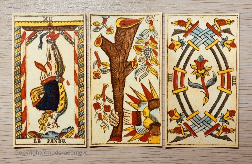 牌面由左至右為:倒吊人、權杖一、寶劍四。看到這組牌的瞬間,我感到一種近乎赤裸的暴露感,彷彿內心深處的不安與恐懼被直接翻開,無所遁形。即使有些難以啟齒,我仍繼續將感受說出來。