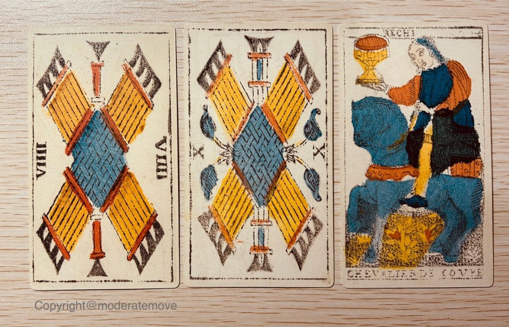 馬賽塔羅牌往往呈現中性的概念,而圖卡則帶有世俗意義上的好壞,兩者搭配能讓我更直接感受到詮釋上的偏移。它是否讓解讀更正面?或更負面?或者,它是一種暗示,幫助我更快對應當天實際發生的事件?這些過程,都很有趣。截至今時,都讓早晨抽牌很興奮,期待當天又會感受到什麼樣的當頭棒喝,來成為我觀照內心的契機。