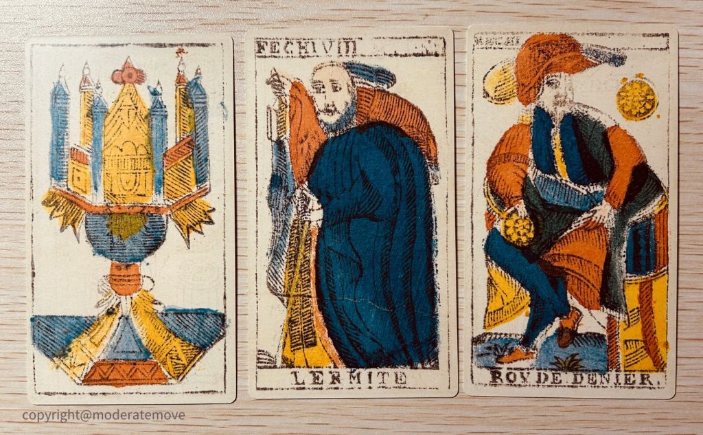 另外,隨著對馬賽塔羅牌的喜愛日增,我發現它帶來了一個意想不到的好處:當我將更多心力投入馬賽塔羅牌的學習與運用時,相對地,對偉特塔羅牌與托特塔羅牌的關注與使用便有所減少。當使用頻率下降,注意力也隨之減少,牌卡的需求自然也下降。換句話說,馬賽塔羅牌幫助我在身心靈的領域,省下了不少購牌的開支。回想來,這實在是一件有趣的事。馬賽塔羅牌這種簡潔、清新的特質,居然能延伸出如此的效果。