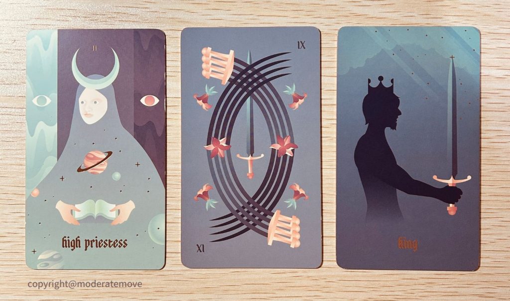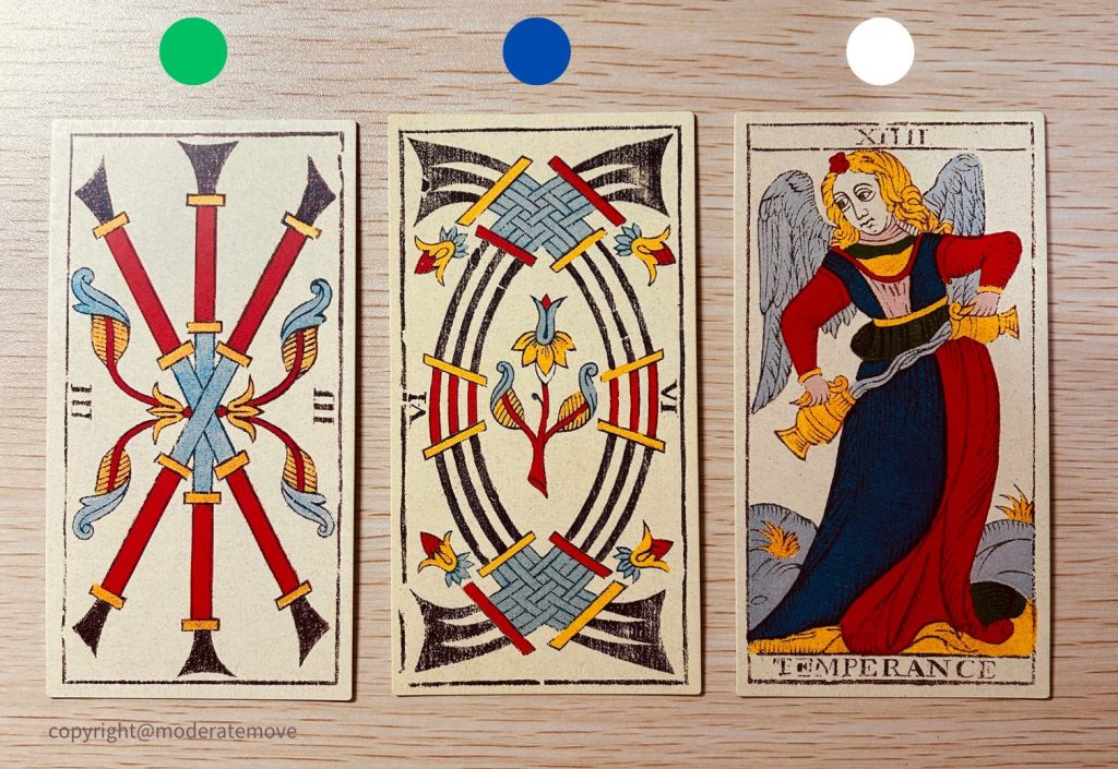 之前在網路瀏覽影片時,看見一位美國的占卜師奶奶 Marilyn 分享自己學習和職業這麼多年的經驗。由於她生長的年代,美國對於馬賽塔羅牌是非常陌生的,因此她也是自學,然後職業,如此營生大半輩子。她分享著:「選擇自己自洽的方法一直練習,就會有成效。對你自己有成效。」我時常採用這個觀點來鼓勵自己,不過直至回顧這次占卜時,才產生更具體的體感。當時抽牌的我,處於自學狀態,對於牌義的理解,總結於書籍的知識和生活經驗。對我而言,三張牌的涵義差別,簡述如下:
