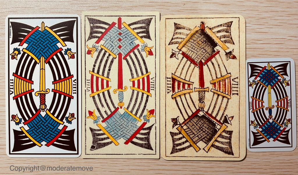 關於牌面中所見的那把寶劍是否存在斷裂,值得進一步說明。由於一代馬賽的經典代表作—— Jean Noblet 於 1650 年版本的寶劍六至寶劍十已遺失,現存紀錄並不完整。市面上的版本多為後人根據其他文獻推敲而來的重製畫面。參考Jean Dodal 於 1701 年的版本(現存最早的完整版),同樣作為一代馬賽的代表牌卡,寶劍九並未顯示斷裂的情況。寶劍的斷裂現象出現在二代馬賽的代表牌—— Nicolas Conver 於 1760 年的版本中。隨後,獲得版權的 Grimaud 家族於1848年出版的版本延續了遺留版畫,寶劍九也顯示出斷裂的特徵。Jodorowsky 與 Conver 家族的後代共同復刻的1970版本(可視為二次創作)自然也延續了二代馬賽的傳統,寶劍九同樣顯示斷裂。然而,Yov Ben-Dov 在重新復刻自己的 CBD Tarot 2010 版本時,寶劍九則未呈現斷裂的情況。